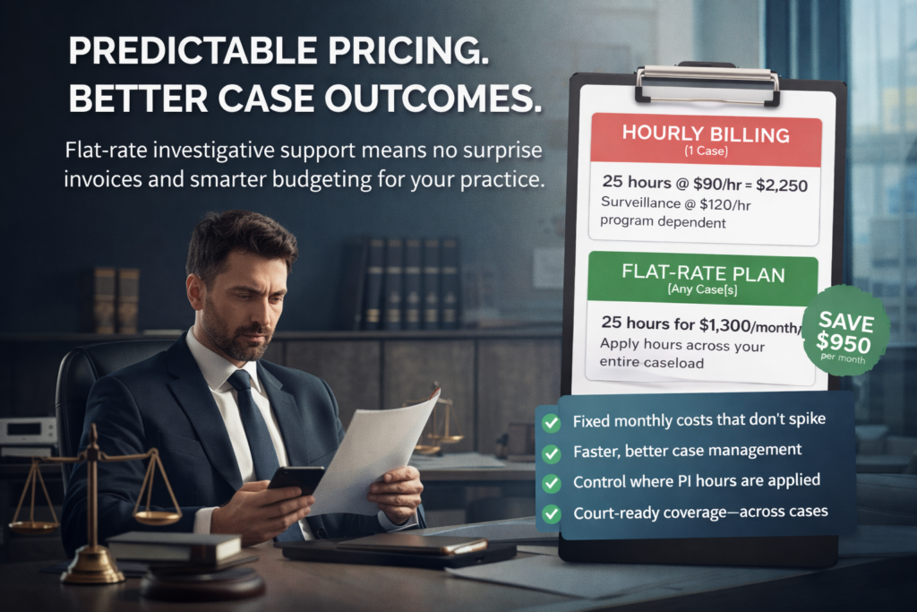 With our Monthly Flat-Rate Plan, defense attorneys get dependable investigative support at a fixed monthly cost—so you can budget confidently, move cases faster, and avoid surprise invoices.
